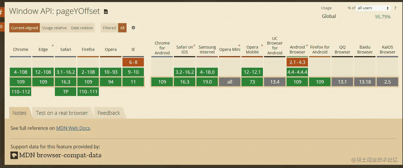 獲取滾動(dòng)位置方法有 window.pageYOffset 和 document.documentElement.scrollTop 。 window.pageYOffset 兼容性是 ie9+ 和其他主流瀏覽器。
