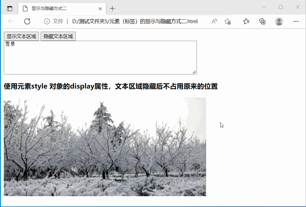 <!DOCTYPE html><html> <head><meta charset='utf-8'><title>顯示與隱藏方式一</title> </head> <body><button type='button' onclick='show()'>顯示文本區(qū)域</button><button type='button' onclick='hide()'>隱藏文本區(qū)域</button><br><textarea cols='70' rows='6' >雪景</textarea><h3>使用HTML 的hidden 屬性,文本區(qū)域隱藏后不占用原來的位置</h3><img src='https://www.jb51.net/javascript/雪景.jpg'><script> function show(){var t = document.getElementById('output');//選取id為test的元素t.hidden=false; } function hide(){var t = document.getElementById('output');//選取id為test的元素t.hidden=true; // 設(shè)置隱藏元素 }</script> </body></html>保存文件名為:元素(標(biāo)簽)的顯示與隱藏方式一.html,用瀏覽器打開效果: