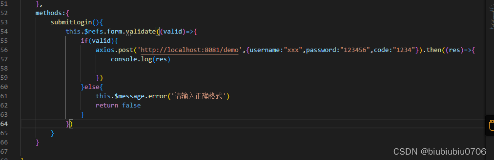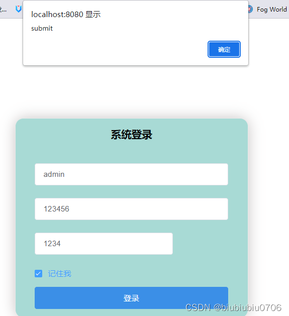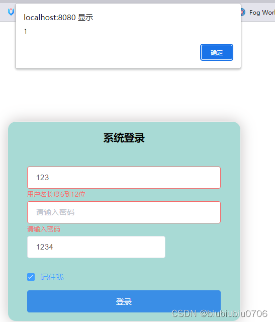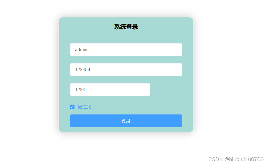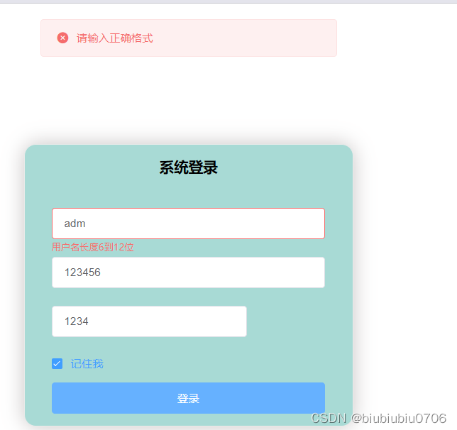 <template> <div> <el-form :rules="rules" ref="form" :model="loginForm"> <h3>系統(tǒng)登錄</h3> <!-- auto-complete="false"自動(dòng)補(bǔ)全 --> <el-form-item prop="username"> <el-input type="text" auto-complete="false" v-model="loginForm.username" placeholder="請(qǐng)輸入用戶名"></el-input> </el-form-item> <el-form-item prop="password"><el-input type="text" auto-complete="false" v-model="loginForm.password" placeholder="請(qǐng)輸入密碼"></el-input> </el-form-item> <el-form-item prop="code"><el-input type="text" auto-complete="false" v-model="loginForm.code" placeholder="點(diǎn)擊圖片更換驗(yàn)證碼"></el-input><img :src="captchaUrl"/> </el-form-item> <el-checkbox v-model="checked">記住我</el-checkbox> <el-button type="primary" @click="submitLogin">登錄</el-button> </el-form> </div></template> <script>import axios from "axios"export default { name:"Login", data(){return{ captchaUrl:"",//驗(yàn)證碼圖片鏈接 loginForm:{username:"admin",password:"123456",code:"1234" }, checked:true, rules:{username:[ {required:true,message:"請(qǐng)輸入用戶名",trigger:"blur"}, {min:5,max:12,message:"用戶名長(zhǎng)度6到12位",trigger:"blur"}],password:[ {required:true,message:"請(qǐng)輸入密碼",trigger:"blur"}, {min:6,max:12,message:"密碼長(zhǎng)度6到12位",trigger:"blur"}],code:[ {required:true,message:"請(qǐng)輸入驗(yàn)證碼",trigger:"blur"}, {min:4,max:4,message:"驗(yàn)證碼長(zhǎng)度4位",trigger:"blur"}], }} }, methods:{submitLogin(){ this.$refs.form.validate((valid)=>{if(valid){ axios.post("http://localhost:8081/demo",{username:"xxx",password:"123456",code:"1234"}).then((res)=>{console.log(res) })}else{ this.$message.error("請(qǐng)輸入正確格式") return false} })} } }</script> <style> .loginContainer{border-radius: 15px;background-clip: padding-box;margin:180px auto;width:350px;padding: 15px 35px 15px 35px;background: #a8dad5;border:1px solid #eaeaea;box-shadow: 0 0 25px #cac6c6; } .loginTitle{margin: 0px auto 40px auto;text-align: center; } .loginRemeber{text-align: left;margin:0px 0px 15px 0px; }</style>總結(jié)