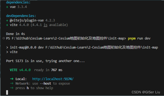 2 . 運(yùn)行環(huán)境配置接下來(lái),我們需要進(jìn)行 cesium 庫(kù)以及其他依賴庫(kù)的安裝。按下 Ctrl+C 暫時(shí)關(guān)閉項(xiàng)目,然后輸入以下命令進(jìn)行 cesium 的安裝: