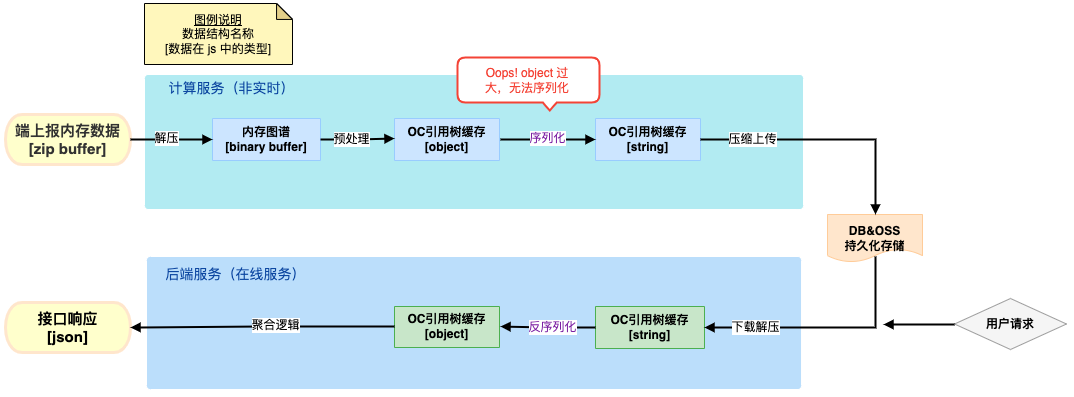 在 Nodejs 計算服務中,對端上上報的內存信息二進制數據進行預處理+緩存時,遇到了一個奇怪的報錯:RangeError: Invalid string length 。根據該報錯信息,查找得知是字符串長度超過了 node.js 的限制,即 2^29-1 (約 5 億+)個字符。整體流程如圖所示。