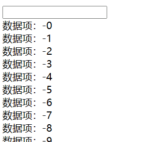 import React, { useCallback, useState } from 'react'const index: React.FC = () => { const [list, setList] = useState<any[]>([]) const handleSearch = useCallback((value: string) => { const newList = [] for (let i = 0; i < 5000; i++) {newList.push(value + '-' + i) } setList(newList) }, []) return (<> <input onChange={(e) => handleSearch(e.target.value)} type='text' /> <div>{list.map(item => <div key={item}>數據項:{item}</div>)} </div></> )}export default index當我們進行持續的輸入時是十分的卡頓的,效果如下: