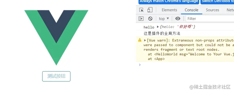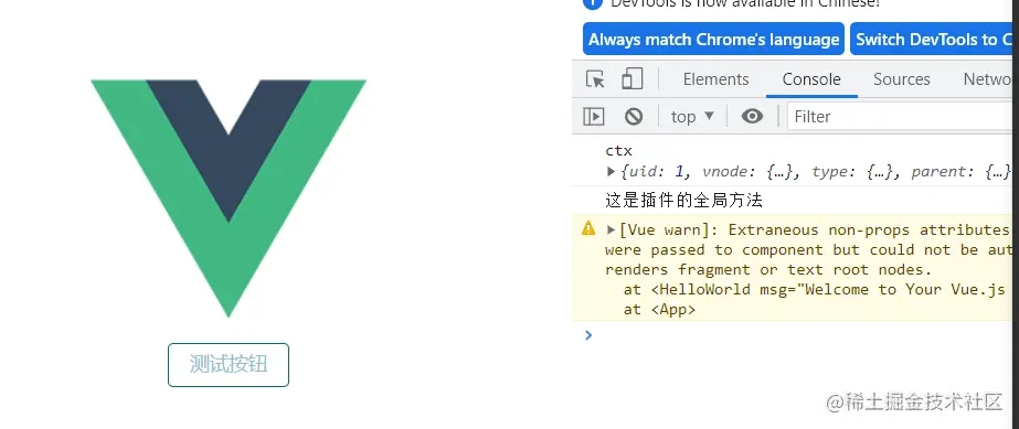 // myPlugin.jsexport default { install: (app, options) => { // 注入一個全局可用的方法 app.config.globalProperties.$myMethod = () => { console.log("這是插件的全局方法"); } // 添加全局指令 app.directive("my-directive", { bind () { console.log("這是插件的全局指令"); } }) // 將options傳給插件用戶 app.provide("options", options); }}// main.jsimport { createApp } from "vue"import App from "./App.vue"import ElementPlus from "element-plus"import "element-plus/dist/index.css"import myPlugin from "./plugins/myPlugin"createApp(App).use(ElementPlus).use(myPlugin, { hello: "你好呀"}).mount("#app");// 組件中使用<template> <div v-my-directive></div> <el-button @click="clicFunc">測試按鈕</el-button></template><script setup>import { getCurrentInstance, inject } from "vue";const ctx = getCurrentInstance();const hello = inject("options");console.log("hello", hello);const clicFunc = ctx.appContext.app.config.globalProperties.$myMethod();</script>效果如下: