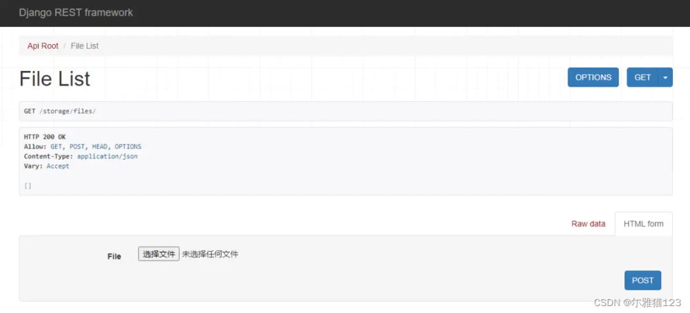 運(yùn)行后臺(tái)服務(wù) python manage.py runserver 0.0.0.0:8000,訪問 http://xx.xx.xx.xx:8000/storage/files/,界面如下: