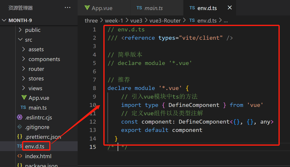 // env.d.ts/// <reference types='vite/client' /> // 簡單版本// declare module '*.vue' // 推薦使用declare module '*.vue' { // 引入vue模塊中ts的方法 import type { DefineComponent } from 'vue' // 定義vue組件以及類型注解 const component: DefineComponent<{}, {}, any> export default component}