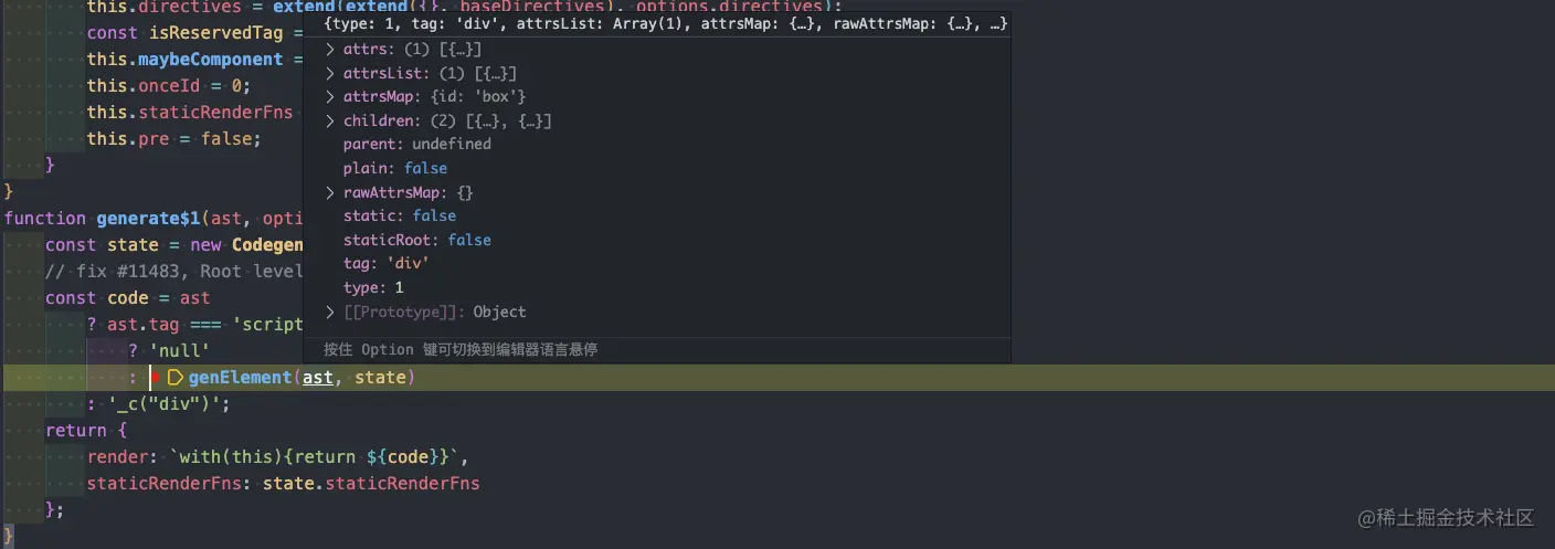 // 將AST預(yù)發(fā)轉(zhuǎn)義成render函數(shù)字符串export function genElement(el: ASTElement, state: CodegenState): string { if (el.parent) { el.pre = el.pre || el.parent.pre } if (el.staticRoot && !el.staticProcessed) { // 輸出靜態(tài)樹 return genStatic(el, state) } else if (el.once && !el.onceProcessed) { // 處理v-once指令 return genOnce(el, state) } else if (el.for && !el.forProcessed) { // 處理循環(huán)結(jié)構(gòu) return genFor(el, state) } else if (el.if && !el.ifProcessed) { // 處理條件語法 return genIf(el, state) } else if (el.tag === 'template' && !el.slotTarget && !state.pre) { // 處理子標簽 return genChildren(el, state) || 'void 0' } else if (el.tag === 'slot') { // 處理插槽 return genSlot(el, state) } else { // 處理組件和dom元素 ... return code }}通過genElement函數(shù)包裝處理后,將vue 模板的 template 標簽部分轉(zhuǎn)換為 render 函數(shù),如下所示: