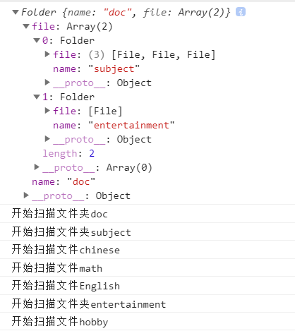 //掃描文件夾 folder 和 file 兩個類var Folder = function (name) { this.name = name; this.file = []}Folder.prototype.add = function (file) { this.file.push(file)}Folder.prototype.scan = function () { console.log('開始掃描文件夾'+this.name) for(var i=0;i<this.file.length;i++){this.file[i].scan() }}var File = function(name){ this.name = name;}File.prototype.add = function(){ throw new Error('文件下面不能再添加文件')}File.prototype.scan = function () { console.log('開始掃描文件'+this.name)}var chinese = new File('chinese')var math = new File('math')var English = new File('English')var hobby = new File('hobby')var folder1=new Folder('subject');folder1.add(chinese)folder1.add(math)folder1.add(English)var folder2=new Folder('entertainment')folder2.add(hobby)var folder=new Folder('doc')folder.add(folder1)folder.add(folder2)console.log(folder)folder.scan()運行結果如下: