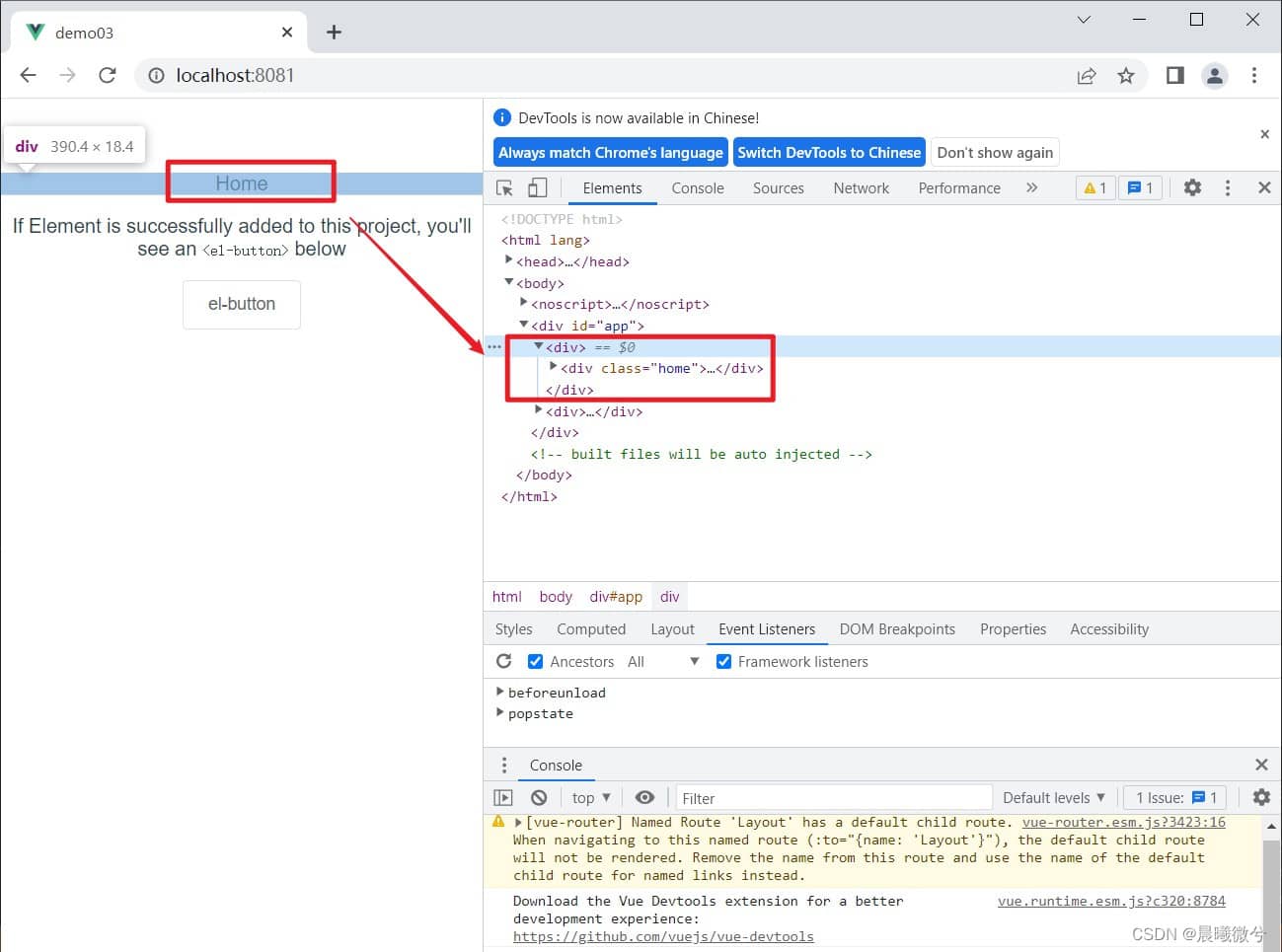 //App.vue中<template> <div id='app'>//關鍵是 router-view 能否成功渲染 <router-view></router-view> <div> <p>If Element is successfully added to this project, you'll see an<code v-text=''<el-button>''></code>below </p> <el-button>el-button</el-button> </div> </div></template><script>export default { name: 'app', components: { }}</script>//index.js文件 import Vue from 'vue'import VueRouter from 'vue-router'import HomeView from '../views/main/HomeView.vue'import Layout from '../views/LayoutView.vue' Vue.use(VueRouter) //1.這里是routes,指定路徑和成員 const routes = [ { path: '/', name: 'Layout',//以下的 component(這是對的) 千萬注意,不要寫成 components(這是錯的) component: Layout, children: [ {path: '',name: 'Home',component: HomeView,meta: { isLogin: true} }, {path: 'params',name: 'params',component: () => import('../views/main/ParamsView.vue'),meta: { isLogin: true} }, {path: 'ad',name: 'ADclassify',component: () => import('../views/main/ADClassify.vue'),meta: { isLogin: true} }, {path: 'product',name: 'product',component: () => import('../views/main/ProductView.vue'),meta: { isLogin: true} } ] }, { path: '/login', name: 'Login', component: () => import('../views/LoginView.vue'), meta: { isLogin: true } }]//2.這里是router,是一個VueRouter對象const router = new VueRouter({ mode: 'history', base: process.env.BASE_URL, routes//3.這里是routes,對應1中指定的內容}) export default router以上,沒什么問題的話,可以看到