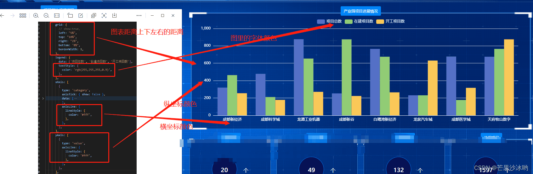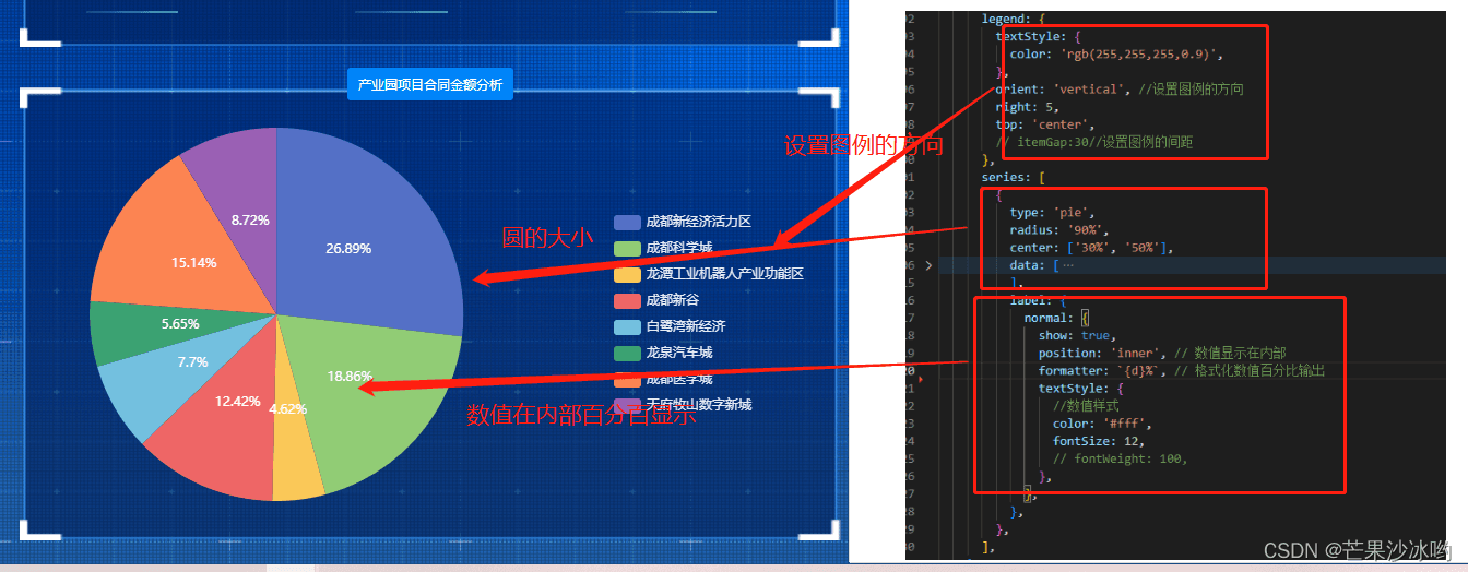 const option = { tooltip: {trigger: 'axis',axisPointer: { type: 'shadow',}, }, grid: {// show:true,left: '5%',top: '10%',right: '2%',bottom: '8%',borderWidth: 1, }, legend: {data: ['項目總數', '在建項目數', '開工項目數'],textStyle: { color: 'rgb(255,255,255,0.9)',}, }, xAxis: [{ type: 'category', axisTick: { show: false }, data: [ '成都新經濟', '成都科學城', '龍潭工業機器', '成都新谷', '白鷺灣新經濟', '龍泉汽車城', '成都醫學城', '天府牧山數字', ], axisLine: { lineStyle: { color: '#fff', }, },}, ], yAxis: [{ type: 'value', axisLine: { lineStyle: { color: '#fff', }, },}, ], };2.餅圖的數值在內部百分百顯示:
