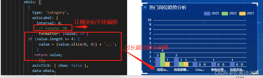 目錄 1.修改橫縱坐標的顏色2.餅圖的數值在內部百分百顯示:3.橫坐標標題過長顯示省略號:補充知識:echarts 橫坐標傾斜總結