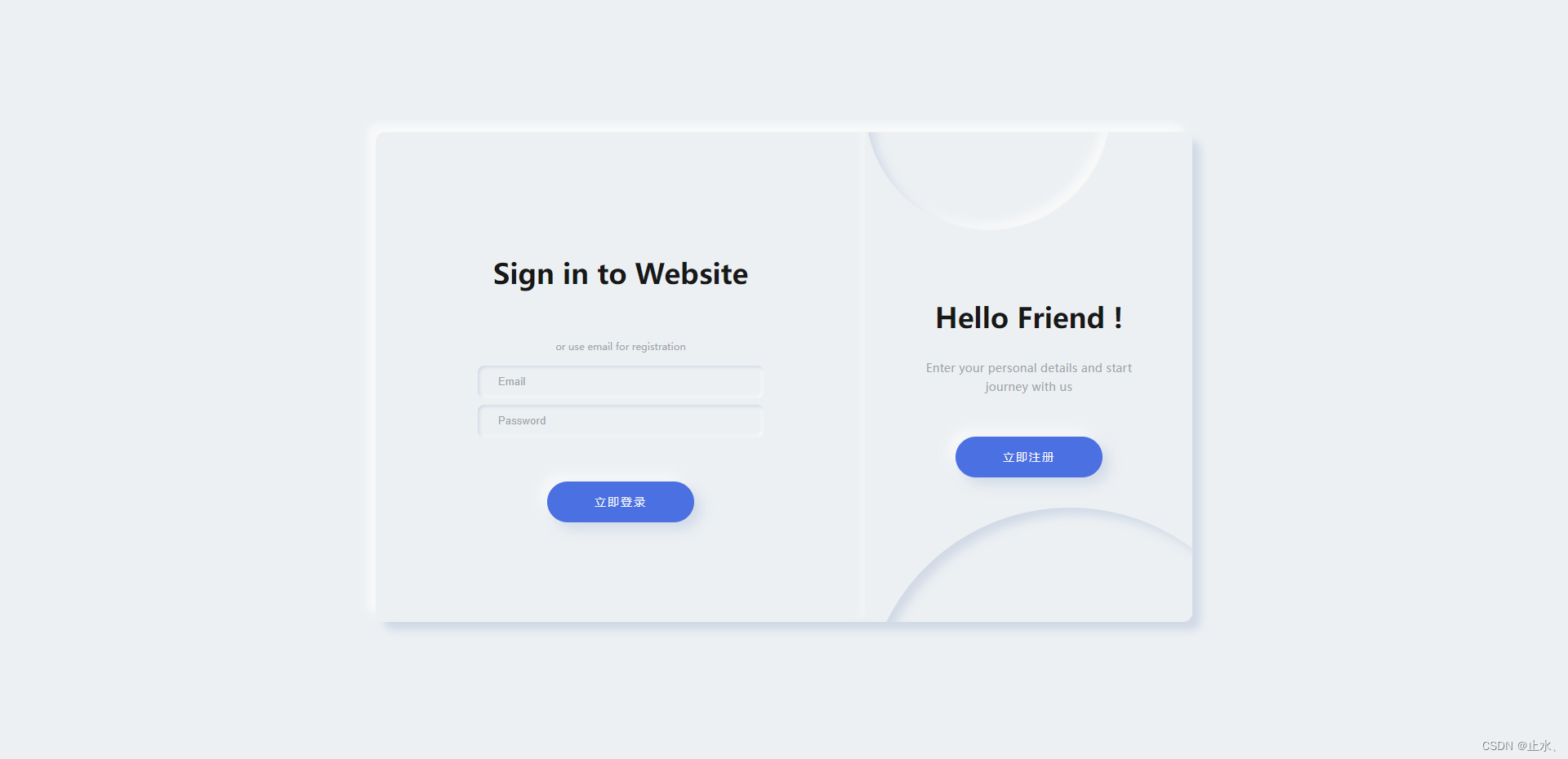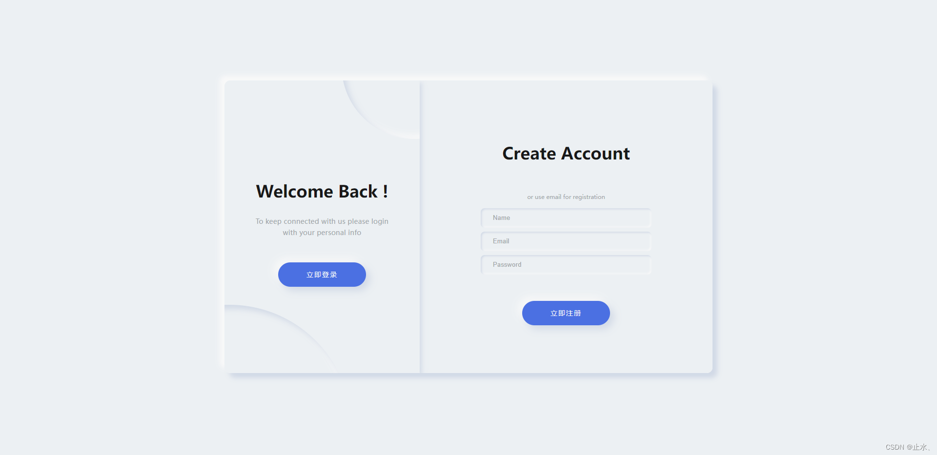 <template> <div class='main-box'> <div :class='['container', 'container-register', { 'is-txl': isLogin }]'> <form><h2 class='title'>Create Account</h2><span class='text'>or use email for registration</span><input type='text' placeholder='Name' /><input type='text' placeholder='Email' /><input type='password' placeholder='Password' /><div class='primary-btn'>立即注冊</div> </form> </div> <div :class='['container', 'container-login', { 'is-txl is-z200': isLogin }]' > <form><h2 class='title'>Sign in to Website</h2><span class='text'>or use email for registration</span><input type='text' placeholder='Email' /><input type='password' placeholder='Password' /><div class='primary-btn'>立即登錄</div> </form> </div> <div :class='['switch', { login: isLogin }]'> <div class='switch__circle'></div> <div class='switch__circle switch__circle_top'></div> <div class='switch__container'><h2>{{ isLogin ? 'Hello Friend !' : 'Welcome Back !' }}</h2><p> {{ isLogin ? 'Enter your personal details and start journey with us' : 'To keep connected with us please login with your personal info' }}</p><div @click='isLogin = !isLogin'> {{ isLogin ? '立即注冊' : '立即登錄' }}</div> </div> </div> </div></template><script>export default { name: 'LoginBox', data() { return { isLogin: false, loginForm: {email: '',password: '', }, registerForm: {name: '',email: '',password: '', }, } }, methods: { login() {}, register() {}, },}</script><style lang='scss' scoped>.main-box { position: relative; width: 1000px; min-width: 1000px; min-height: 600px; height: 600px; padding: 25px; background-color: #ecf0f3; box-shadow: 10px 10px 10px #d1d9e6, -10px -10px 10px #f9f9f9; border-radius: 12px; overflow: hidden; .container { display: flex; justify-content: center; align-items: center; position: absolute; top: 0; width: 600px; height: 100%; padding: 25px; background-color: #ecf0f3; transition: all 1.25s; form { display: flex; justify-content: center; align-items: center; flex-direction: column; width: 100%; height: 100%; color: #a0a5a8; .title {font-size: 34px;font-weight: 700;line-height: 3;color: #181818; } .text {margin-top: 30px;margin-bottom: 12px; } .form__input {width: 350px;height: 40px;margin: 4px 0;padding-left: 25px;font-size: 13px;letter-spacing: 0.15px;border: none;outline: none;// font-family: 'Montserrat', sans-serif;background-color: #ecf0f3;transition: 0.25s ease;border-radius: 8px;box-shadow: inset 2px 2px 4px #d1d9e6, inset -2px -2px 4px #f9f9f9;&::placeholder { color: #a0a5a8;} } } } .container-register { z-index: 100; left: calc(100% - 600px); } .container-login { left: calc(100% - 600px); z-index: 0; } .is-txl { left: 0; transition: 1.25s; transform-origin: right; } .is-z200 { z-index: 200; transition: 1.25s; } .switch { display: flex; justify-content: center; align-items: center; position: absolute; top: 0; left: 0; height: 100%; width: 400px; padding: 50px; z-index: 200; transition: 1.25s; background-color: #ecf0f3; overflow: hidden; box-shadow: 4px 4px 10px #d1d9e6, -4px -4px 10px #f9f9f9; color: #a0a5a8; .switch__circle { position: absolute; width: 500px; height: 500px; border-radius: 50%; background-color: #ecf0f3; box-shadow: inset 8px 8px 12px #d1d9e6, inset -8px -8px 12px #f9f9f9; bottom: -60%; left: -60%; transition: 1.25s; } .switch__circle_top { top: -30%; left: 60%; width: 300px; height: 300px; } .switch__container { display: flex; justify-content: center; align-items: center; flex-direction: column; position: absolute; width: 400px; padding: 50px 55px; transition: 1.25s; h2 {font-size: 34px;font-weight: 700;line-height: 3;color: #181818; } p {font-size: 14px;letter-spacing: 0.25px;text-align: center;line-height: 1.6; } } } .login { left: calc(100% - 400px); .switch__circle { left: 0; } } .primary-btn { width: 180px; height: 50px; border-radius: 25px; margin-top: 50px; text-align: center; line-height: 50px; font-size: 14px; letter-spacing: 2px; background-color: #4b70e2; color: #f9f9f9; cursor: pointer; box-shadow: 8px 8px 16px #d1d9e6, -8px -8px 16px #f9f9f9; &:hover { box-shadow: 4px 4px 6px 0 rgb(255 255 255 / 50%),-4px -4px 6px 0 rgb(116 125 136 / 50%),inset -4px -4px 6px 0 rgb(255 255 255 / 20%),inset 4px 4px 6px 0 rgb(0 0 0 / 40%); } }}</style>總結