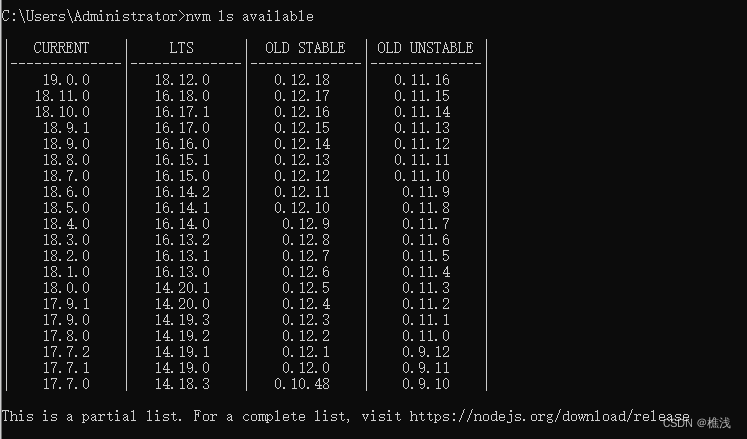 執(zhí)行 nvm ls available 查詢可用歷史版本