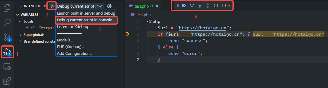 <?php $url = 'https://hotaigc.cn'; if ($url == 'https://hotaigc.cn') {echo 'success'; } else {echo 'error'; }我們在if這里打個斷點,運行效果如圖: