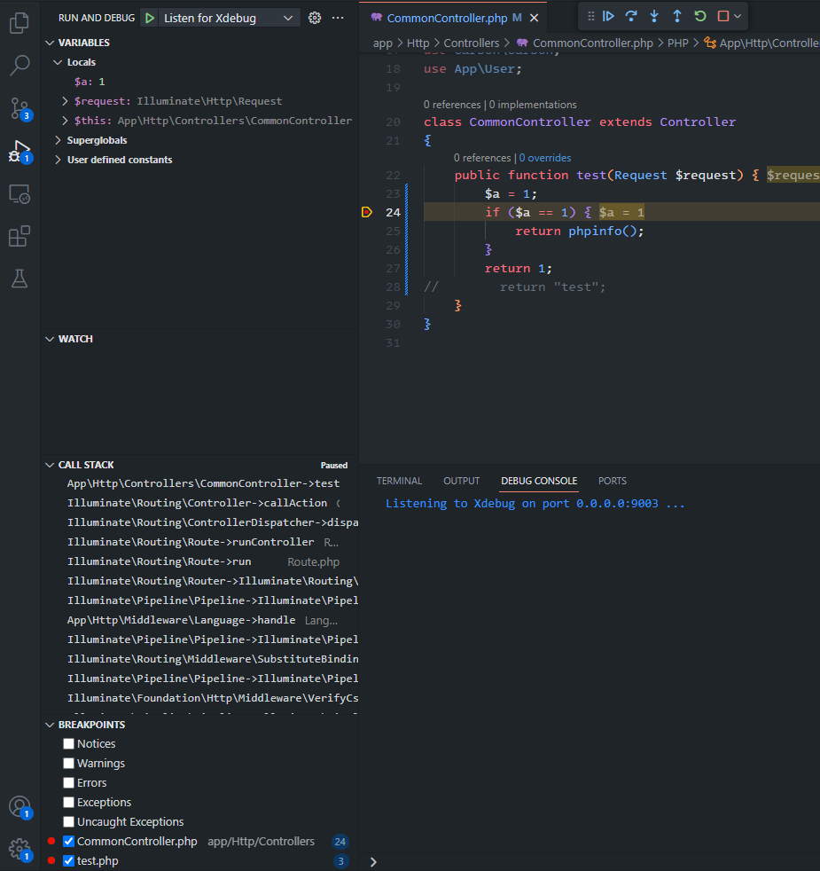 class CommonController extends Controller{ public function test(Request $request) {$a = 1;if ($a == 1) { return phpinfo();}return 1; }}2. 啟動調試選擇Listen for Xdebug調試模式,然后啟動調試(第3張圖中有示例)