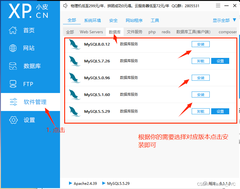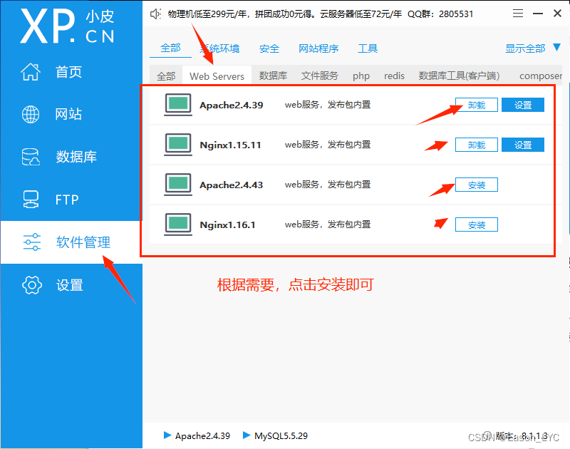一般需要配置Web Server 、數據庫和php 大家可以根據需要安裝指定版本軟件,點擊安裝按鈕即可。 Web Server 安裝apache或者nginx指定版本服務器數據庫:安裝mysql指定版本數據庫php: 安裝指定版本的php
