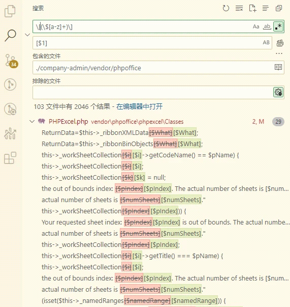 如果條件允許可以更換插件使用phpspreadsheet,如果條件不允許,我們只能修改PHPExcel里的{},使其變成[]來保證PHP7.4環境下可以使用具體操作步驟1.在PHPExcel文件夾下使用正則匹配{($[a-z][+][0-9])}找到要修改的地方