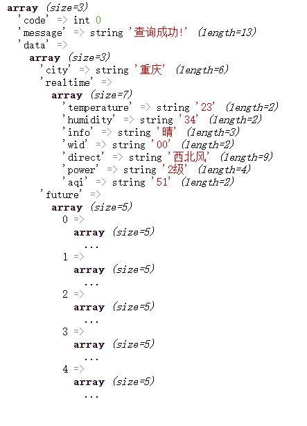 public function test() {$url = 'https://api.topthink.com/weather/query';$param = [ 'appCode'=>'填之前(二)里面自己的Appcode', 'city'=>'重慶'];$header = array('Content-Type: application/x-www-form-urlencoded; charset=UTF-8');//must have it ↑$res = http($url,$param,'GET',$header);$res = json_decode($res,true);if($res['code']!=0) return \json('接口調(diào)用出錯啦');var_dump($res); }(3)康康結(jié)果?