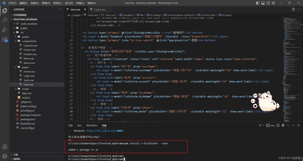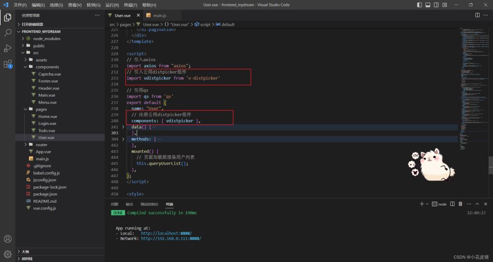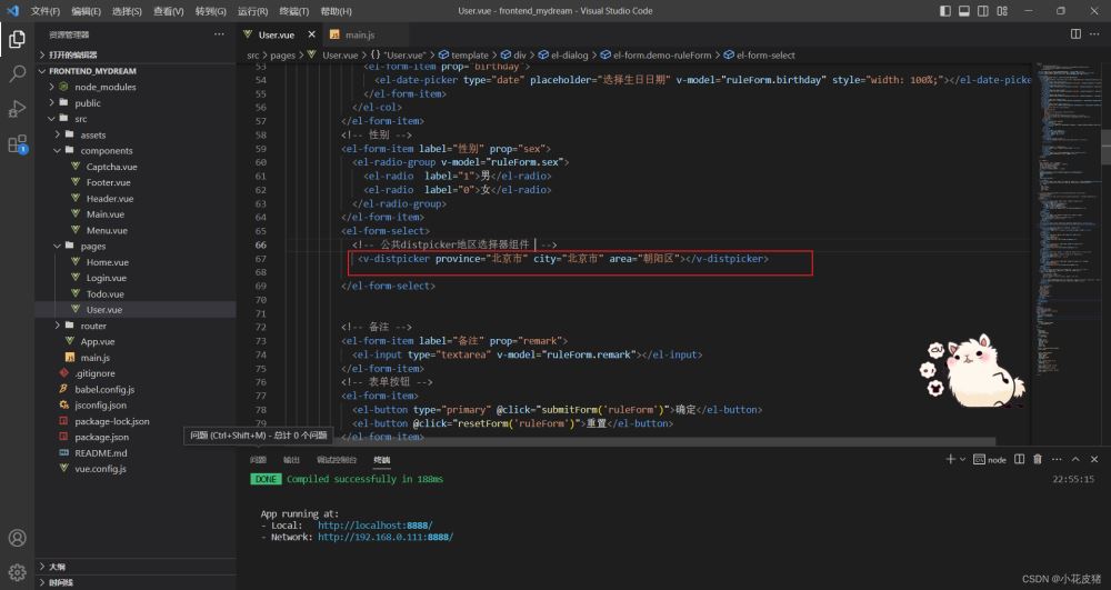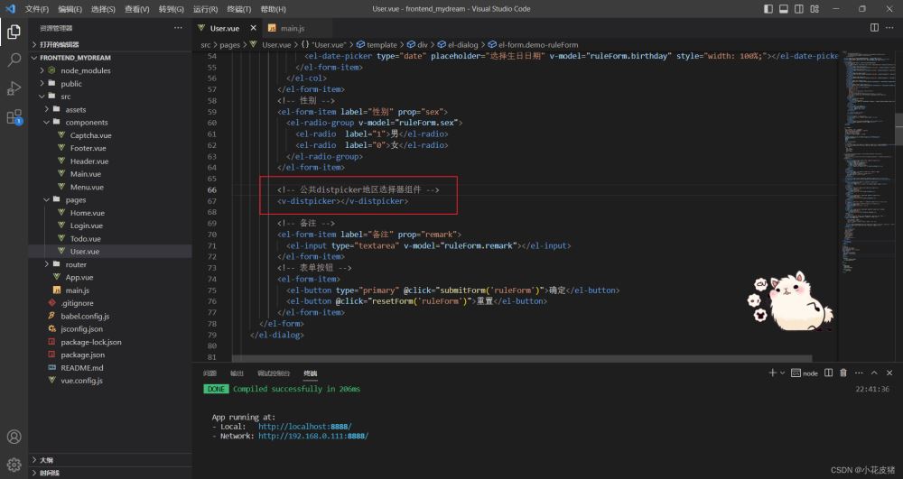 比如我現在這個組件想要使用我們注冊的公共distpicker 組件,我們就可以直接引用過來進行使用了。