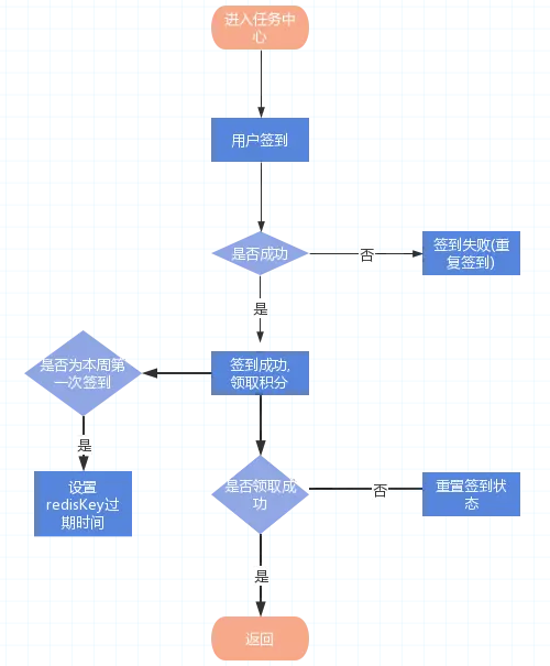 需求以自然周為周期進(jìn)行簽到;展示簽到周期;重復(fù)簽到提示報(bào)錯;流程圖