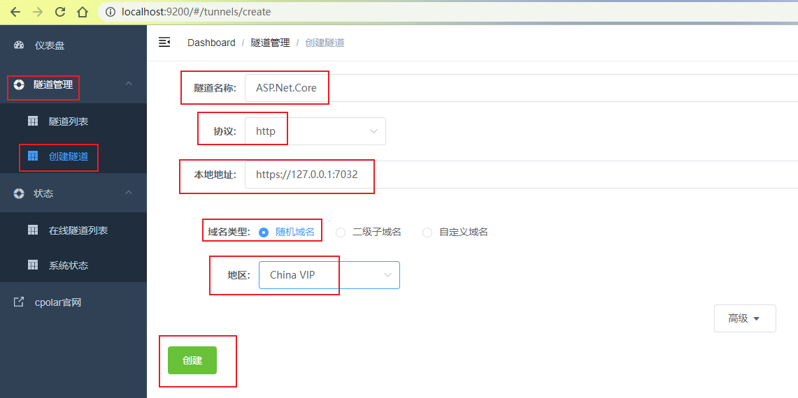隧道名稱:可自定義命名,注意不要與已有的隧道名稱重復(fù)協(xié)議:選擇http本地地址:https://127.0.0.1:7032域名類型:免費選擇隨機域名地區(qū):選擇China vip點擊創(chuàng)建