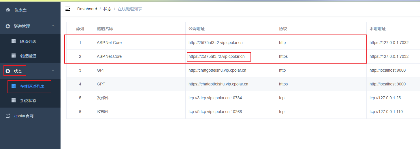 隧道創(chuàng)建成功后,點擊左側(cè)的狀態(tài)——在線隧道列表,查看所生成的公網(wǎng)地址,有兩種訪問方式,一種是http 和https
