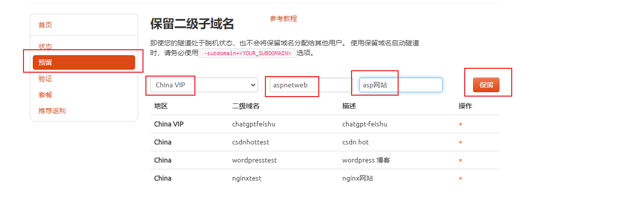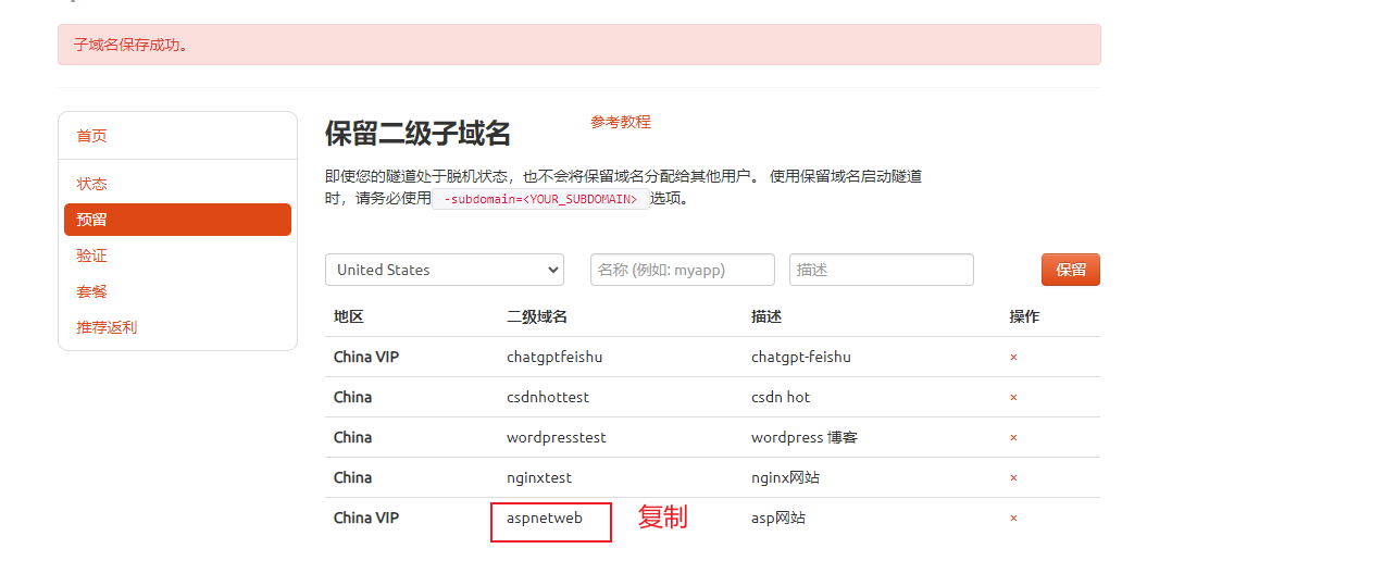 登錄cpolar官網(wǎng),點擊左側(cè)的預(yù)留,選擇保留二級子域名,設(shè)置一個二級子域名名稱,點擊保留,保留成功后復(fù)制保留的二級子域名名稱