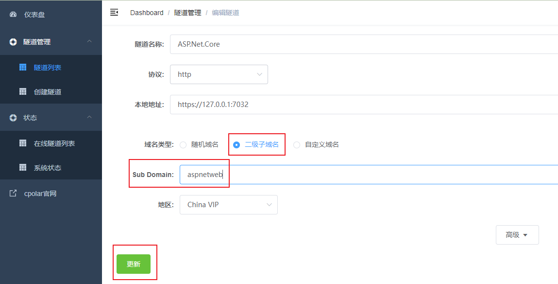 修改隧道信息,將保留成功的二級子域名配置到隧道中