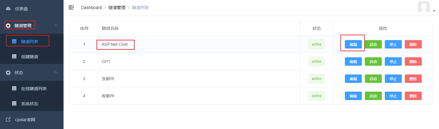 登錄cpolar web UI管理界面,點擊左側(cè)儀表盤的隧道管理——隧道列表,找到所要配置的3000隧道,點擊右側(cè)的編輯