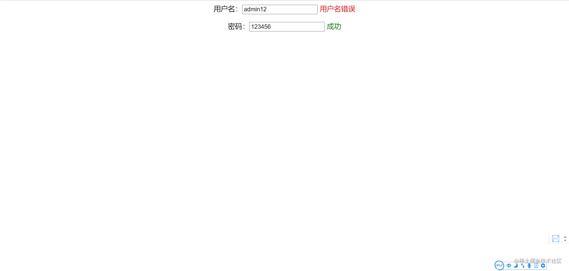 寫loginController控制器package com.controller;import org.springframework.web.bind.annotation.RequestMapping;import org.springframework.web.bind.annotation.RestController;@RestControllerpublic class loginController { @RequestMapping('/login') public String login(String username,String password){String message='';//要先判斷用戶名是否為空if(username!=null){ //這里用戶名寫死為admin if ('admin'.equals(username)) {message='成功'; }else {message='用戶名錯誤'; }}//先判斷密碼是否為空if(password!=null){ //這里密碼寫死為123456 if(password.equals('123456')){message='成功'; }else {message='密碼錯誤'; }}//返回message到前端return message; }}前端頁面login.jsp<%-- Created by IntelliJ IDEA. User: 21781 Date: 2021/12/31 Time: 19:07 To change this template use File | Settings | File Templates.--%><%@ page contentType='text/html;charset=UTF-8' language='java' %><html><head> <title>Title</title> <script src='https://www.jb51.net/program/${pageContext.request.contextPath}/static/js/jquery-3.6.0.js'></script> <script>//驗證用戶名是否正確function a1() { //{'username':$('#username').val()}為傳入后端的參數值 $.post('${pageContext.request.contextPath}/login',{'username':$('#username').val()},function (data) {if (data.toString()=='成功'){//表示用戶名正確 $('#name').css('color','green')}else { $('#name').css('color','red')}$('#name').html(data) })}//驗證密碼是否正確function a2() { $.post('${pageContext.request.contextPath}/login',{'password':$('#password').val()},function (data) {if (data.toString()=='成功'){//表示用戶名正確 $('#ped').css('color','green')}else { $('#ped').css('color','red')}$('#ped').html(data) })} </script></head><body><p align='center'> <!--onblur焦點失去事件,鼠標一離開即觸發事件--> 用戶名:<input type='text' onblur='a1()'> <!--用于寫提示信息--> <span id='name'></span></p><p align='center'> 密碼:<input type='text' onblur='a2()'> <!--用于寫提示信息--> <span id='ped'></span></p></body></html>測試如下