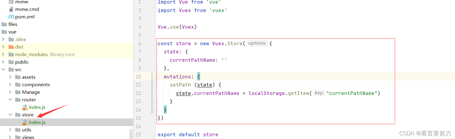 import Vue from "vue"import Vuex from "vuex" Vue.use(Vuex) const store = new Vuex.Store({ state: { currentPathName: "" }, mutations: { setPath (state) { state.currentPathName = localStorage.getItem("currentPathName") } }}) export default store 3.main.js