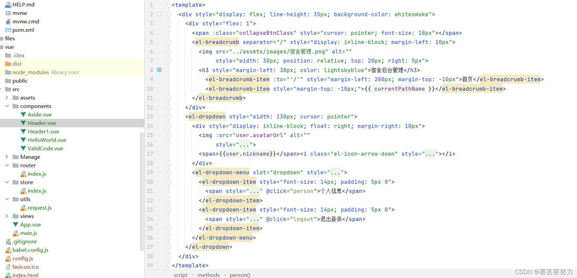 <template> <div> <div> <span :class="collapseBtnClass"></span> <el-breadcrumb separator="/"><img src="../assets/images/宿舍管理.png" ><h3>宿舍后臺(tái)管理</h3> <el-breadcrumb-item :to=""/"">首頁(yè)</el-breadcrumb-item> <el-breadcrumb-item>{{ currentPathName }}</el-breadcrumb-item> </el-breadcrumb> </div> <el-dropdown> <div><img :src="user.avatarUrl" ><span>{{user.nickname}}</span><i></i> </div> <el-dropdown-menu slot="dropdown"><el-dropdown-item> <span @click="person">個(gè)人信息</span></el-dropdown-item><el-dropdown-item> <span @click="logout">退出登錄</span></el-dropdown-item> </el-dropdown-menu> </el-dropdown> </div></template> <script>export default { name: "Header", props: { collapseBtnClass: String, user: Object }, computed: { currentPathName () { return this.$store.state.currentPathName; //需要監(jiān)聽(tīng)的數(shù)據(jù) } }, data() { return { user: localStorage.getItem("user") ? JSON.parse(localStorage.getItem("user")) : {} } }, methods: { logout() { this.$router.push("/login") this.$message.success("退出成功") }, person(){ this.$router.push("/mall/person") } }}</script> <style scoped> </style>?小結(jié)
