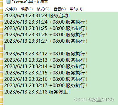 namespace WorkerServiceDemo{ public class Program {public static void Main(string[] args){ IHost host = Host.CreateDefaultBuilder(args) .UseWindowsService(options => { //給服務命名,在Windows服務中的會顯示名字 options.ServiceName = 'NET6故里2130'; }).ConfigureServices(services =>{ services.AddHostedService<Worker>();}).Build(); host.Run();} }}5.服務里面寫啟動,停止,以及執行任務,Worker.cs中寫