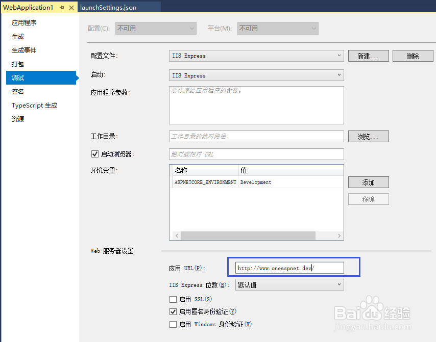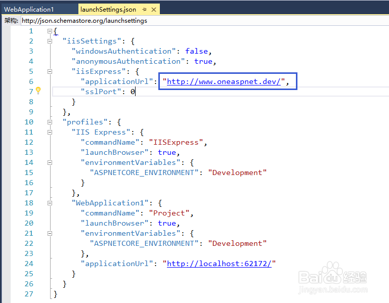 4、也可以直接在launchSettings.json文件中進行修改,如下圖所示: