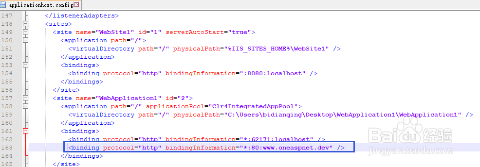 5、修改完成以后我們回到IIS Express的啟動配置文件applicationhost.config,會發現自動多了一條binding節點,如下圖所示: