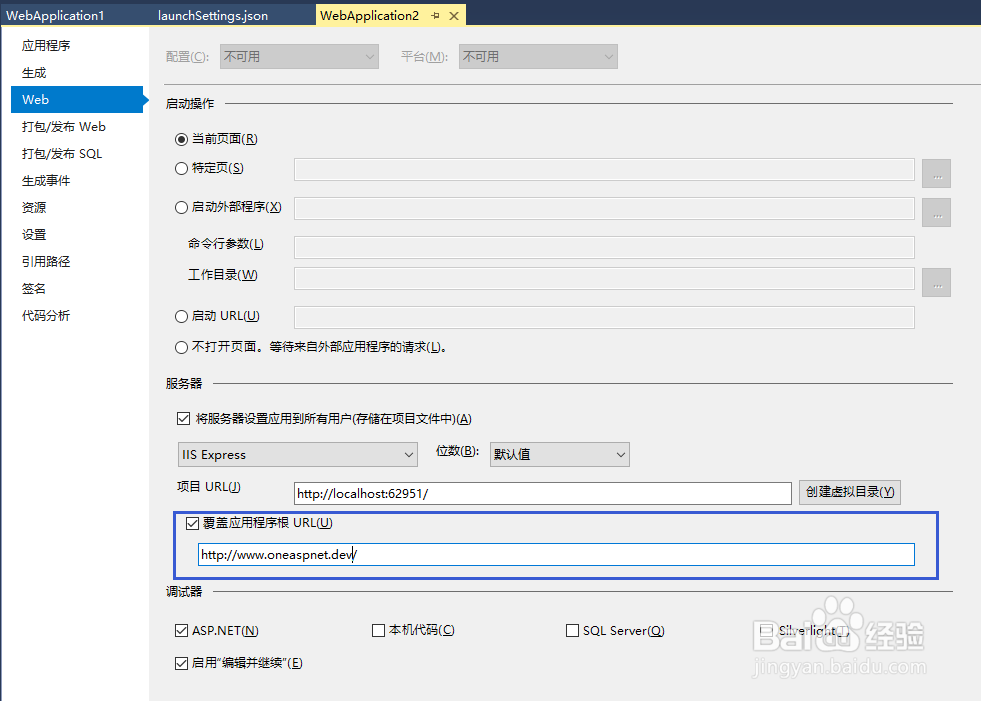 3、在項目上右鍵→屬性,選擇調試選項,修改應用URL,如下圖所示: