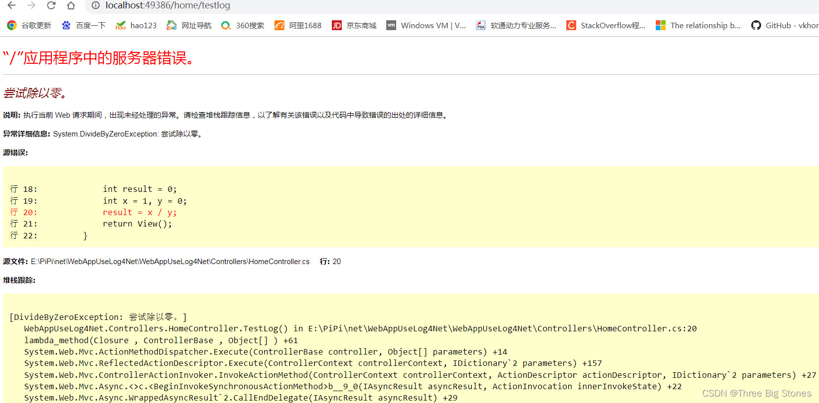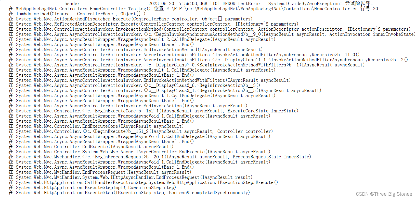 //啟動(dòng)后臺(tái)線程,周期性輪詢異常隊(duì)列,將異常輸出到文件 ThreadPool.QueueUserWorkItem(o => {while(true){ if(MyErrorAttribute.ExceptionQueue.Count>0) {Exception ex = MyErrorAttribute.ExceptionQueue.Dequeue();if(ex!=null){ ILog log = LogManager.GetLogger('testError'); log.Error(ex.ToString());}else{ Thread.Sleep(50);} } else {Thread.Sleep(50); }} });6、控制器中定義異常測(cè)試方法public ActionResult TestLog(){ int result = 0; int x = 1, y = 0; result = x / y; return View();}7、啟動(dòng)程序測(cè)試action方法