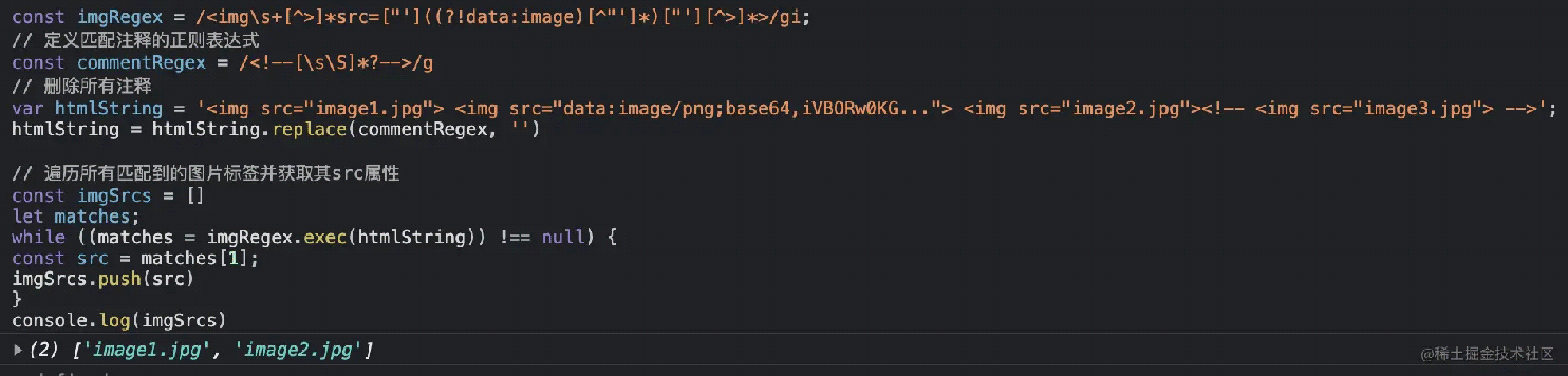 // 定義匹配圖片標簽的正則表達式var imgRegex = /<img\s+[^>]*src=[""]([^""]*)[""][^>]*>/gi;// 定義匹配注釋的正則表達式var commentRegex = /<!--[\s\S]*?-->/g;// 要解析的HTML字符串var htmlString = "<!-- <img src="image3.jpg"> --> <img src="image1.jpg"> <img src="image2.jpg">";// 刪除所有注釋htmlString = htmlString.replace(commentRegex, "");// 遍歷所有匹配到的圖片標簽并獲取其src屬性var matches;while ((matches = imgRegex.exec(htmlString)) !== null) { var src = matches[1]; console.log(src);}