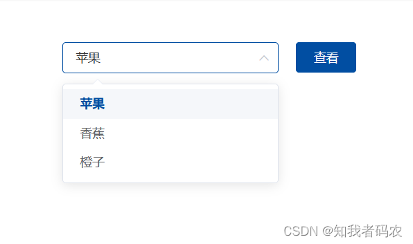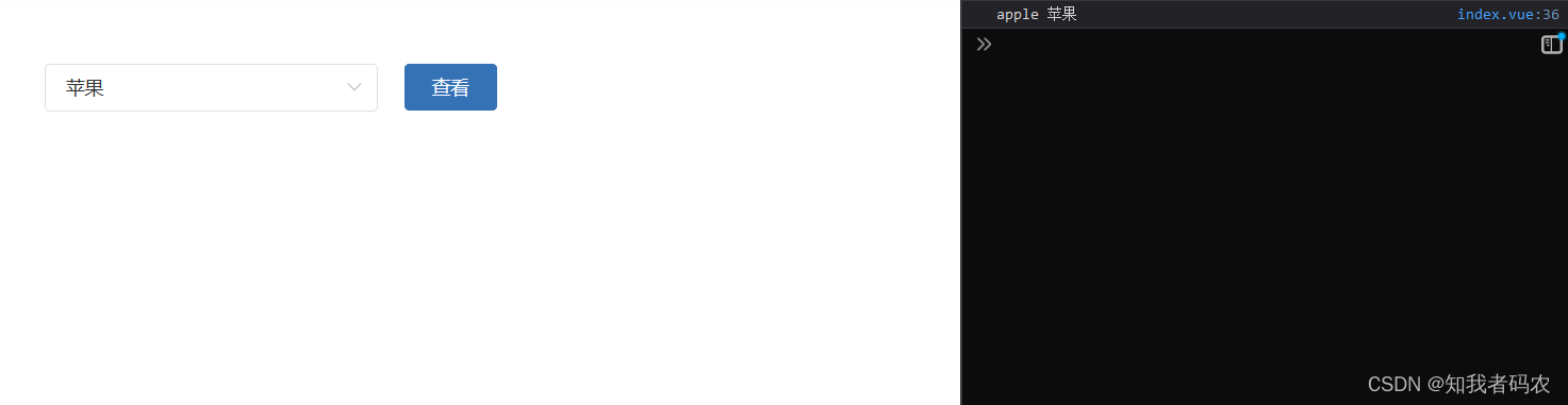 <template> <div> <el-select ref="optionRef" v-model="value" placeholder="請(qǐng)選擇" > <el-optionv-for="item in options":key="item.id":label="item.label":value="item.value + "+" + item.label" > </el-option> </el-select> <el-button @click="showoptions" type="primary" >查看</el-button > </div></template><script>export default { data() { return { value: "banana+香蕉", options: [{ id: 0, label: "蘋果", value: "apple" },{ id: 1, label: "香蕉", value: "banana" },{ id: 2, label: "橙子", value: "orange" }, ], }; }, methods: { showoptions() { console.log(this.value); console.log("value=====", this.value.split("+")[0]); console.log("label=====", this.value.split("+")[1]); }, },};</script>3. 通過(guò)遍歷的形式(不推薦)
