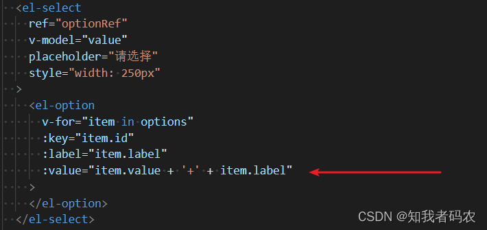 我們?cè)趀l-option渲染時(shí),所設(shè)置的value屬性值可以設(shè)置成label+value的形式,如下圖