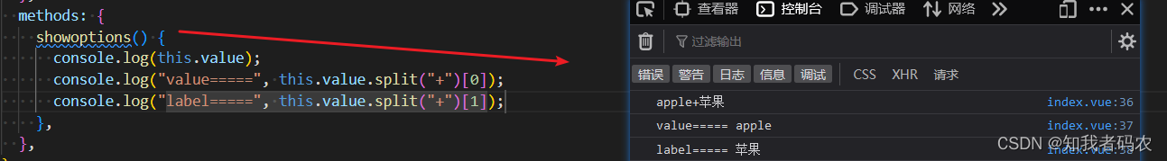獲取后的值形式如下圖,那么+號(hào)前面的就是想要的value值,后面的就是label值了,對(duì)返回的數(shù)據(jù)用split('+')進(jìn)行切割,返回的數(shù)組索引0就是value值,數(shù)組索引1就是label值