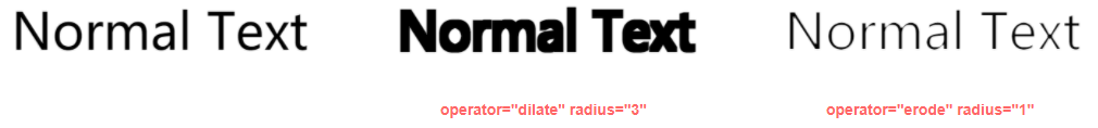 <div><p>Normal Text</p><p>Normal Text</p><p>Normal Text</p></div><svg width="0" height="0"><filter id="dilate"><feMorphology in="SourceAlpha" result="DILATED" operator="dilate" radius="3"></feMorphology></filter><filter id="erode"><feMorphology in="SourceAlpha" result="ERODE" operator="erode" radius="1"></feMorphology></filter></svg>