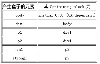 <html> <head> <title>Illustration of containing blocks</title> </head> <body id="body"> <div id="div1"><p id="p1">This is text in the first paragraph...</P> <p id="p2">This is text <em id="em1"> in the <strong id="strong1">second </strong> paragraph. </em> </p> </div> </body></html>