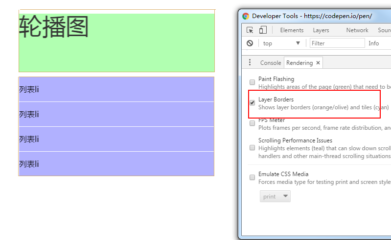 .swiper { position: static; animation: 10s move infinite;} .list { position: relative;} @keyframes move { 100% {transform: translate3d(10px, 0, 0); }}由于給.swiper添加了translate3d(10px, 0, 0)動畫,所以它會生成一個 Graphics Layer,如下圖所示,用開發者工具可以打開層的展示,圖形外的黃色邊框即代表生成了一個獨立的復合層,擁有獨立的 Graphics Layer 。