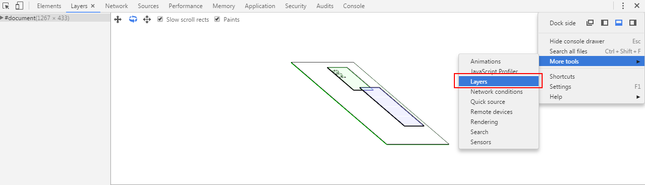 上面觀察頁面層級的 chrome 工具非常吃內存?好像還是一個處于實驗室的功能,分析稍微大一點的頁面容易直接卡死,所以要多學會使用第一種觀察黃色邊框的方式查看頁面生成的 Graphics Layer 這種方式。