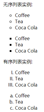ul.a {list-style-type: circle;}ul.b {list-style-type: square;} ol.c {list-style-type: upper-roman;}ol.d {list-style-type: lower-alpha;}例如上述設置后,顯示的為
