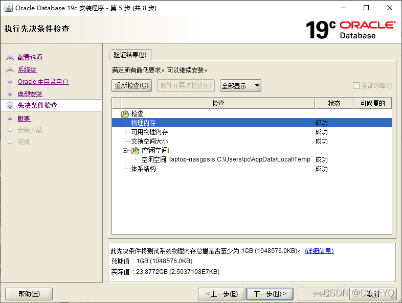6、確認(rèn)安裝,并檢查你的電腦是否符合Oracle安裝的最低配置要求,以及電腦空間是否足夠