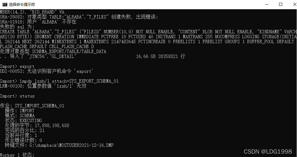 我出現上面的錯誤是因為作業的名稱寫錯了:SYS_EXPORT_SCHEMA_01應該是SYS_IMPORT_SCHEMA_01 才正確!