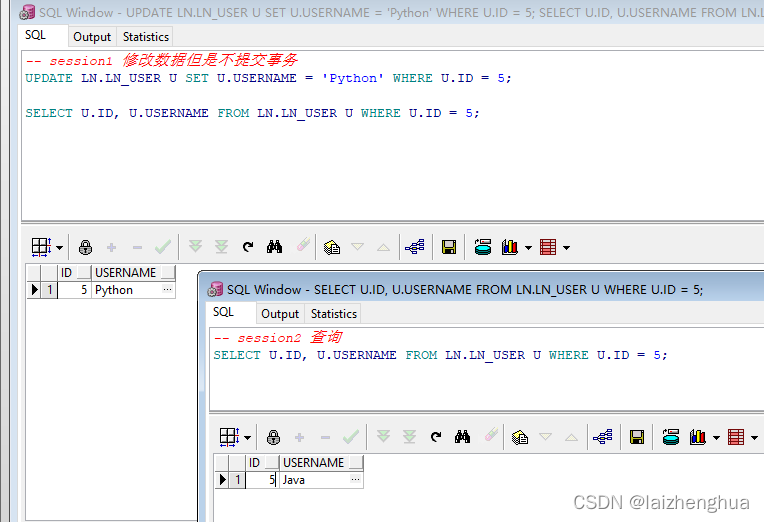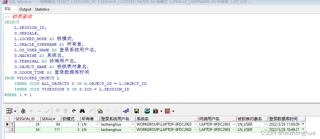 -- 查詢未提交事務的session信息,注意執行以下SQL,用戶需要有DBA權限才行SELECT L.SESSION_ID, S.SERIAL#, L.LOCKED_MODE AS 鎖模式, L.ORACLE_USERNAME AS 所有者, L.OS_USER_NAME AS 登錄系統用戶名, S.MACHINE AS 系統名, S.TERMINAL AS 終端用戶名, O.OBJECT_NAME AS 被鎖表對象名, S.LOGON_TIME AS 登錄數據庫時間FROM V$LOCKED_OBJECT L INNER JOIN ALL_OBJECTS O ON O.OBJECT_ID = L.OBJECT_ID INNER JOIN V$SESSION S ON S.SID = L.SESSION_IDWHERE 1 = 1