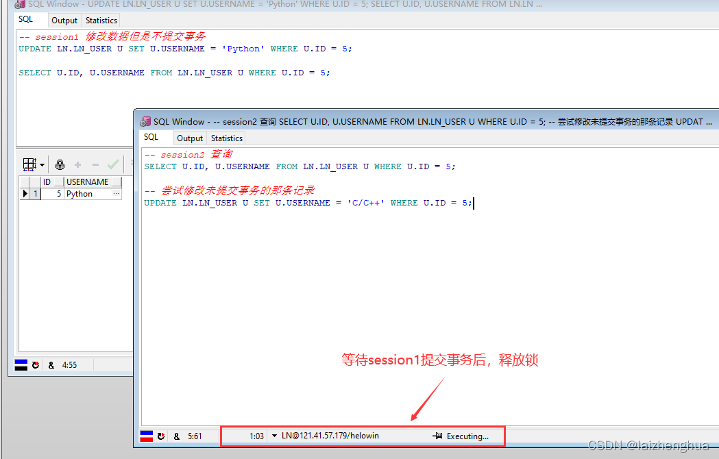 我們可以看到修改未提交事務的記錄會處于一直等待狀態,直到對方釋放鎖資源或強制關閉session1。這里也說明了Oracle做到了行級鎖!