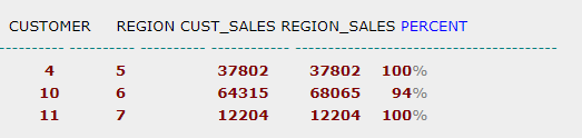 select region_id, customer_id, sum(customer_sales) cust_sales, sum(sum(customer_sales)) over(partition by region_id) ran_total, rank() over(partition by region_id order by sum(customer_sales) desc /* nulls last */) rankfrom user_ordergroup by region_id, customer_id;